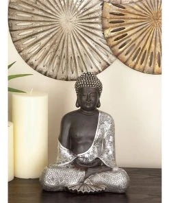 Grayson Lane Bohemian – Silver Poly Stone Buddha Sculpture – 11-in X 9-in