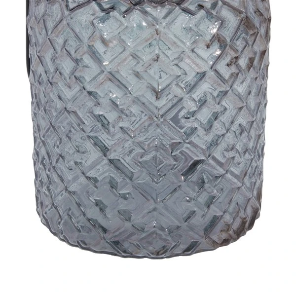 - Features a cylindrical glass body with geometric pattern