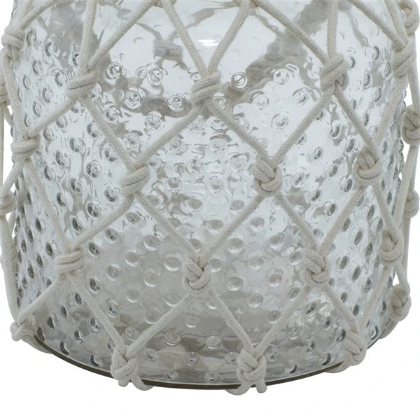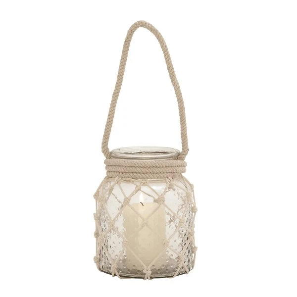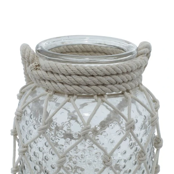 - This round candle holder features clear glass, tapered rim jar with raised dimples and rope accent
