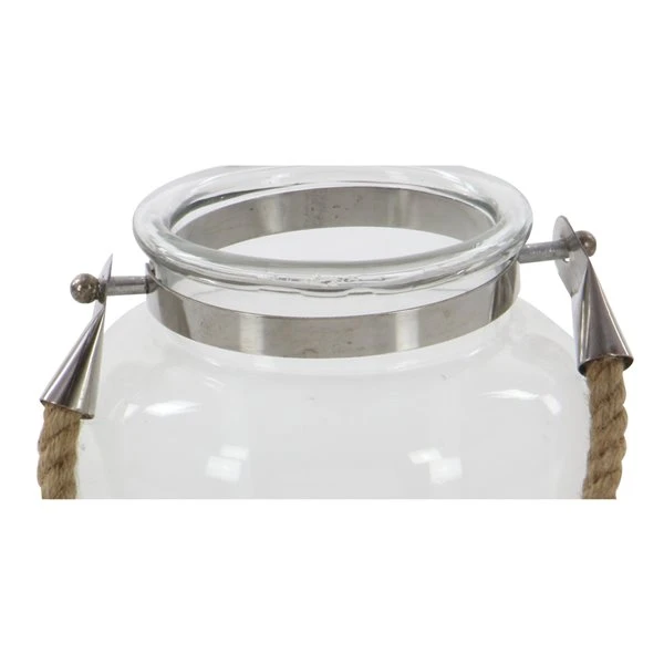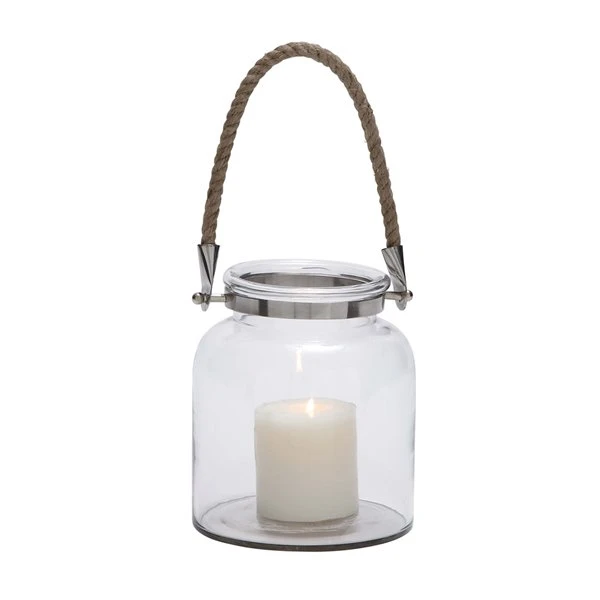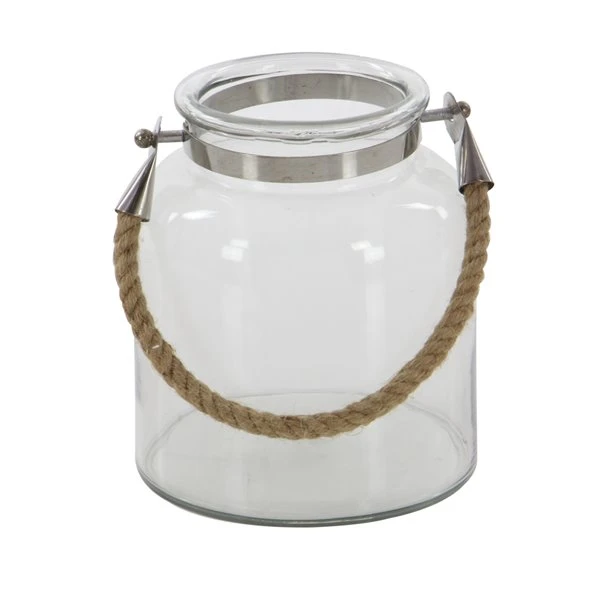 - This finely crafted rope jar candle holder features a clear blown glass exterior with a metal neck ring and jute rope handle
