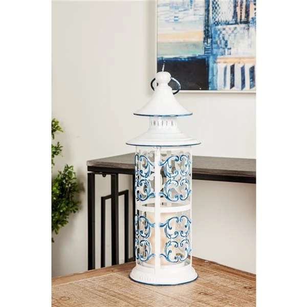 - This cylindrical lantern has acanthus designs in blue, the epitome of country style, along with finial top and ring. It also has a double stacked top with perforated latch lid in white and blue. Its clear glass holder is perfect for pillar candles.