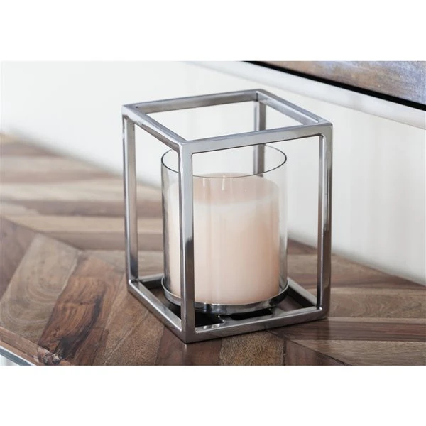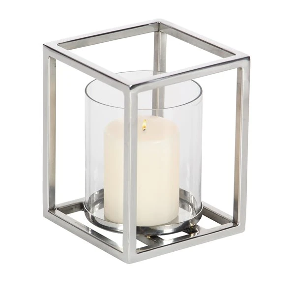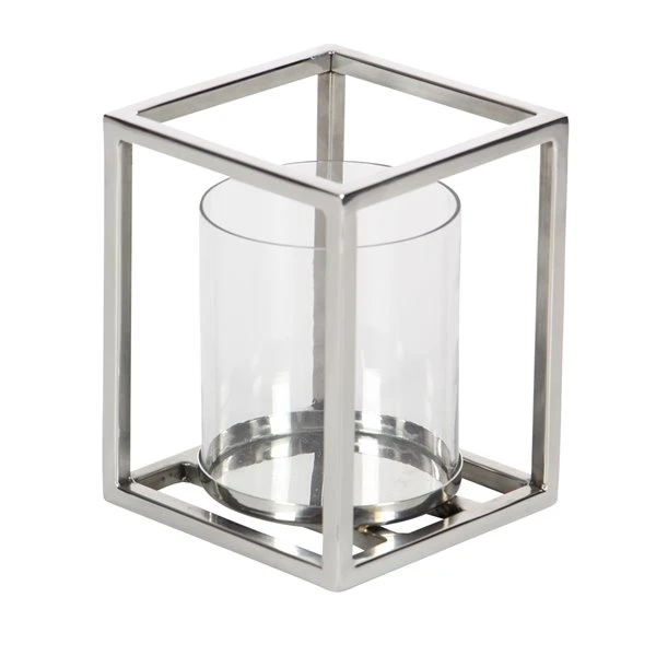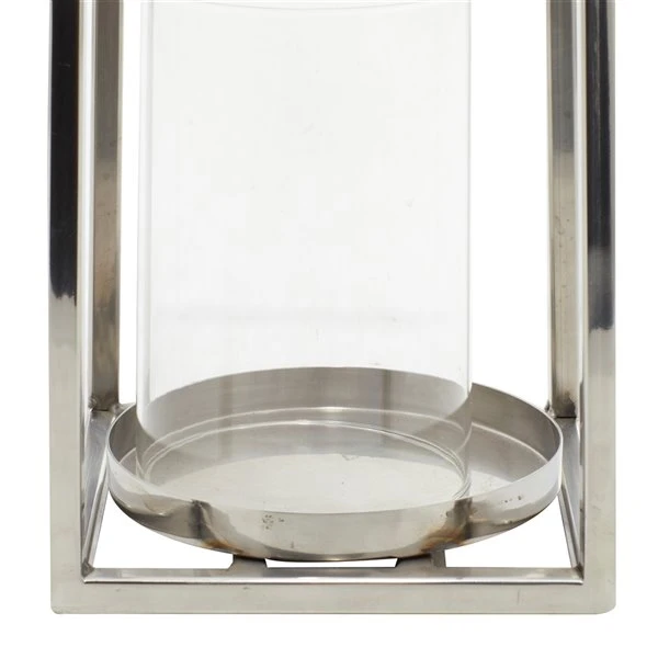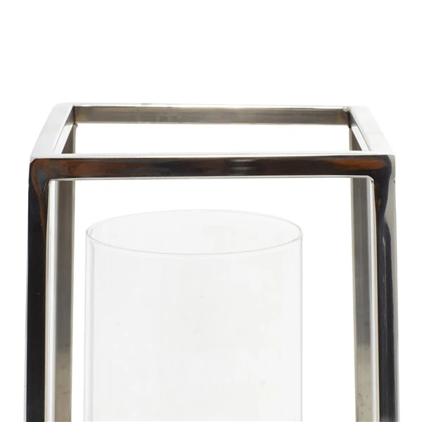 - Features a clear cylindrical glass with stainless steel plate comes with a stainless steel open rectangular frame in silver finish