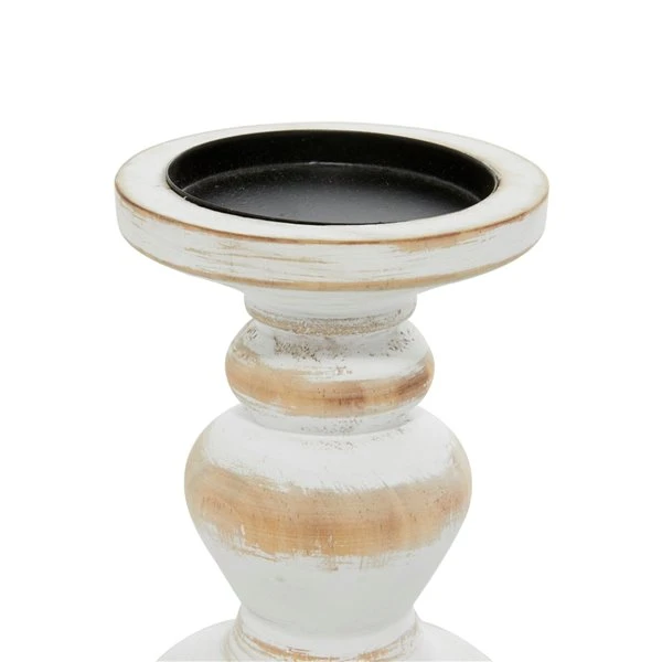 - Each candleholder features a distressed daisy white finish