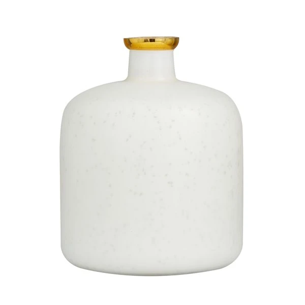 - A white decorative vase featuring a wide round body with smooth coating and narrow mouth opening with gold rim