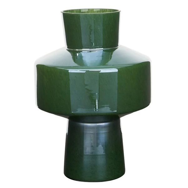 - This geometric green glass vase has a wide centre and narrow opening and base