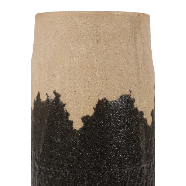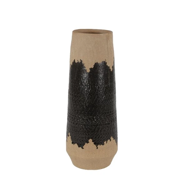 - Bold and unique, this vase has tactile, handmade charm in its hand-painted glossy black glaze pattern over a matte tan base