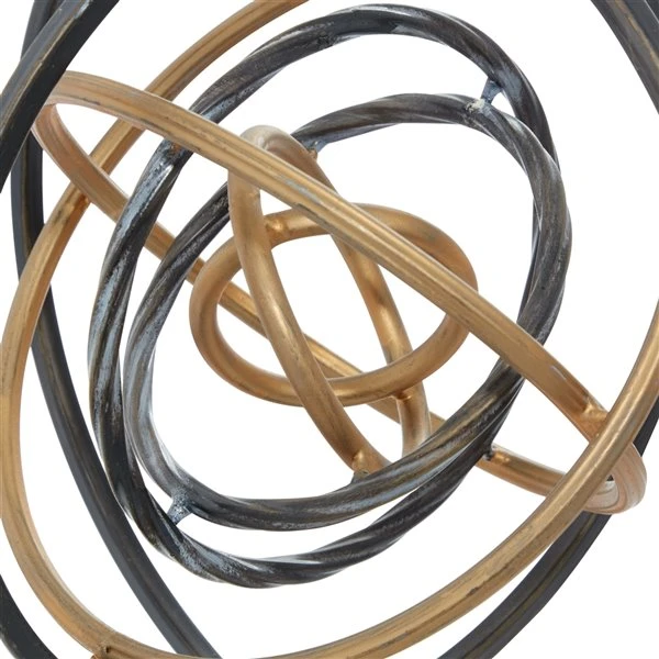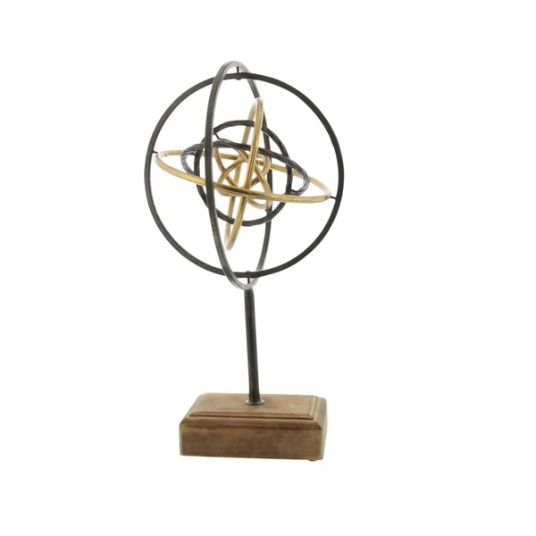 - Black and gold metal orbs intertwined to create a dimensional geometric sculpture on a rectangular, light brown natural wood base