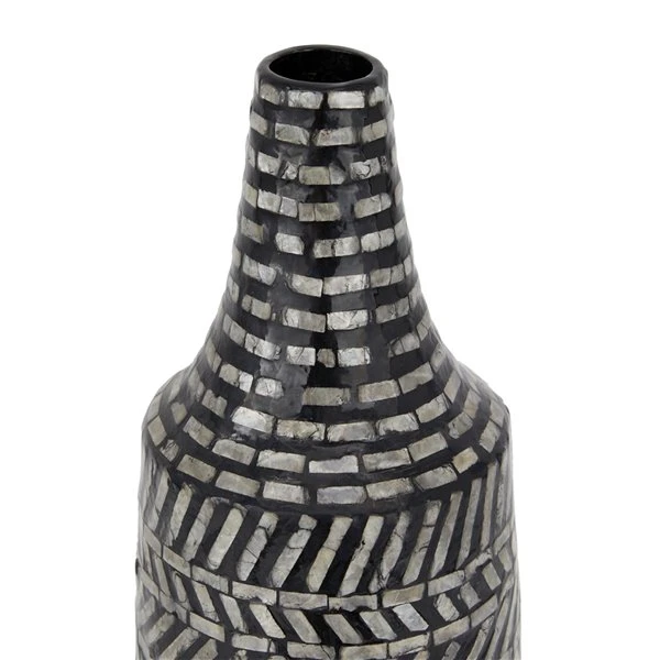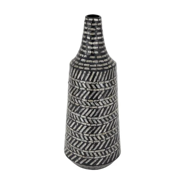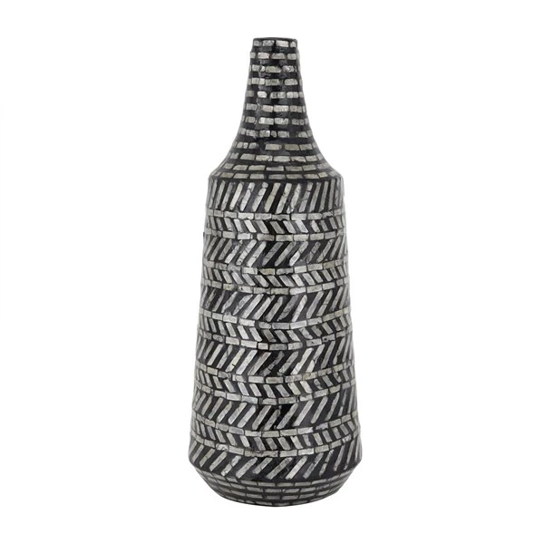 - Mosaic black and white mother-of-pearl overlay embellish this bud vase that gives a metallic black and white polished look