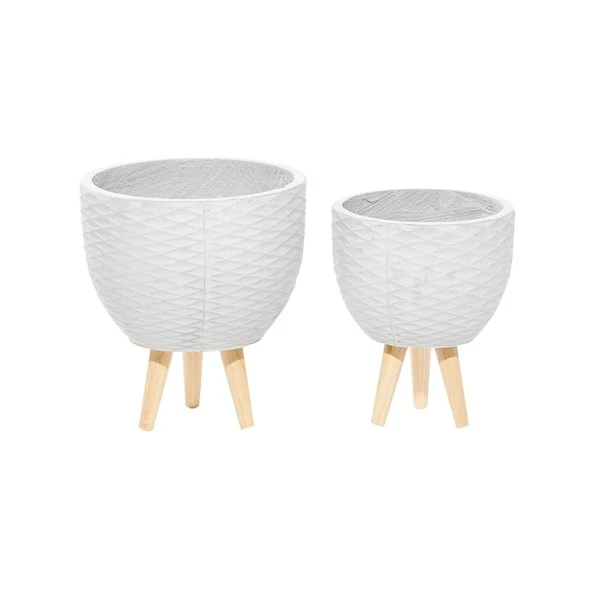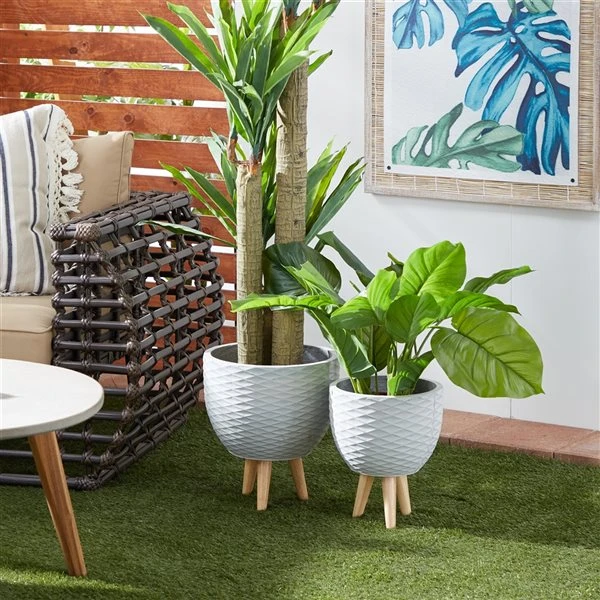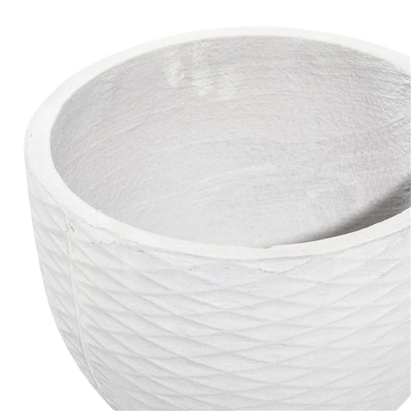 - A ceramic light grey finish with diamond-shaped ribbing surrounds the planters
