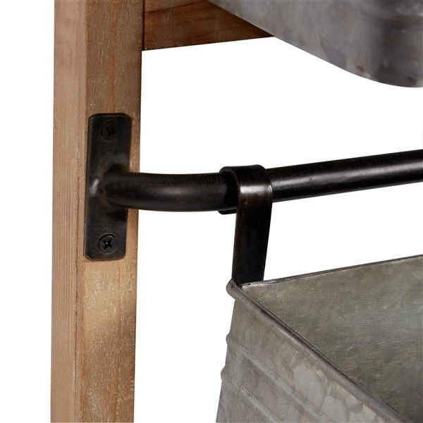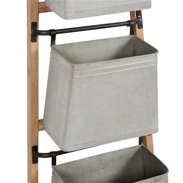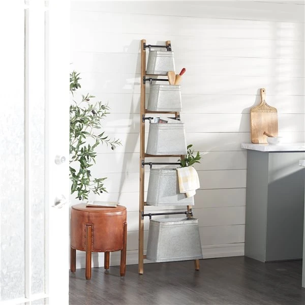 - A ladder-inspired storage shelf that includes 5 trapezoidal metal storage in varying sizes and heights