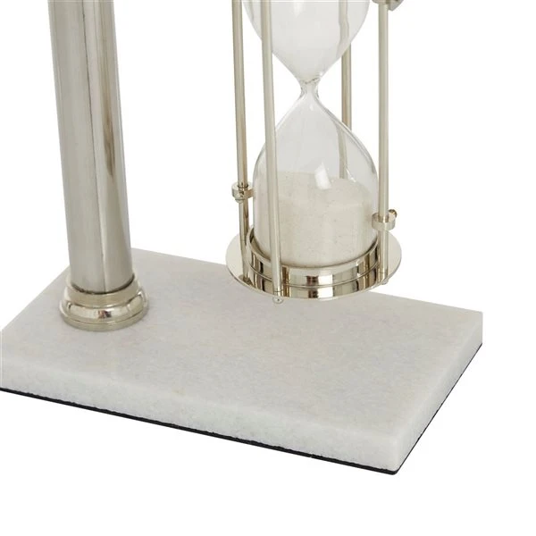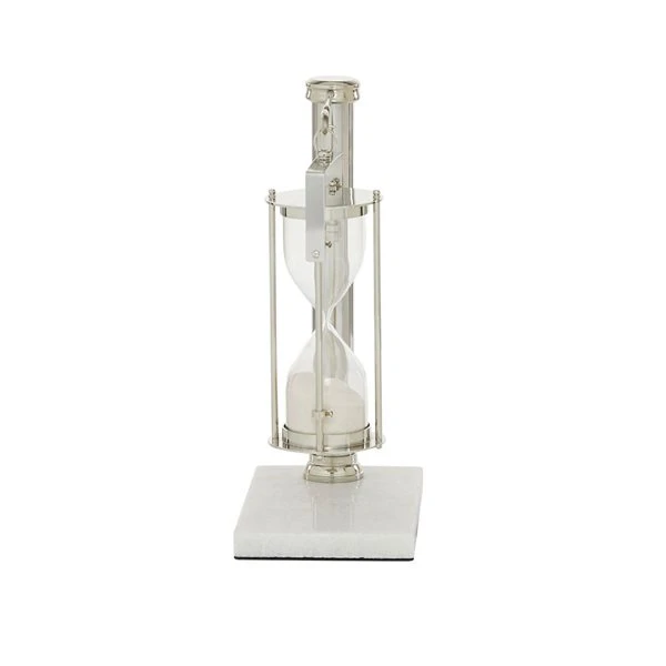 - This interactive silver hourglass timer showcases a hanging hourglass stand feature and a rectangular-shaped marble base design