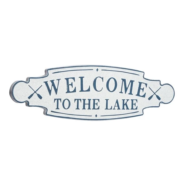 - Large oval metal plaque sign with muted white and dusty blue hues