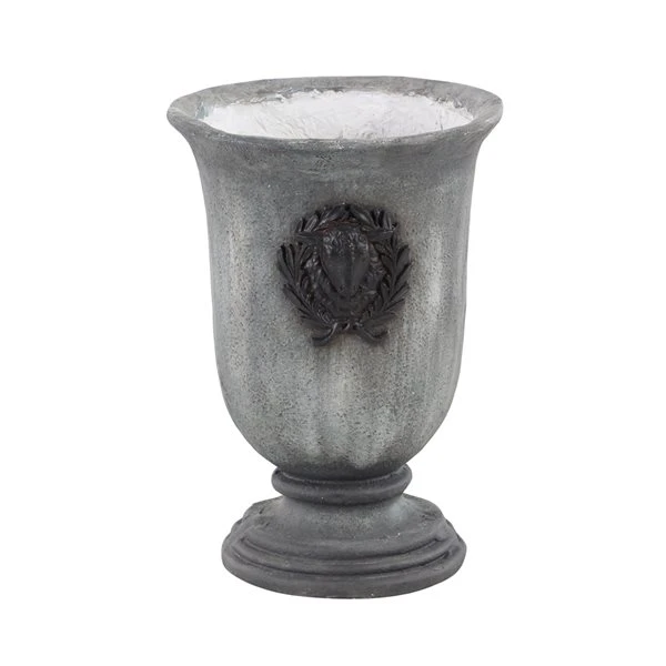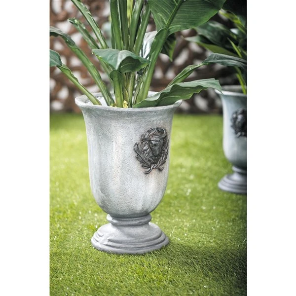 - Tall planter with decorative wreaths on either side