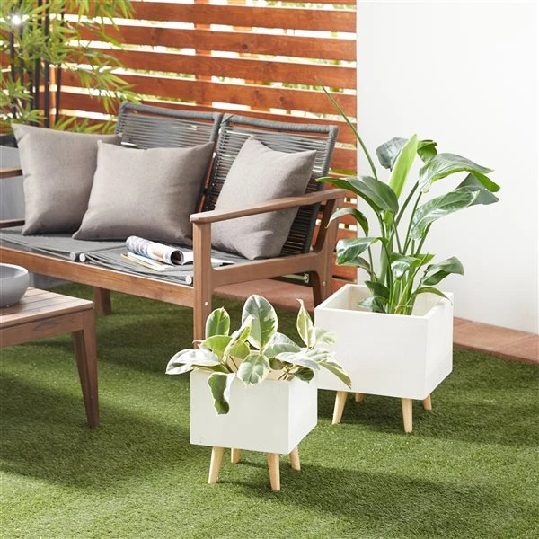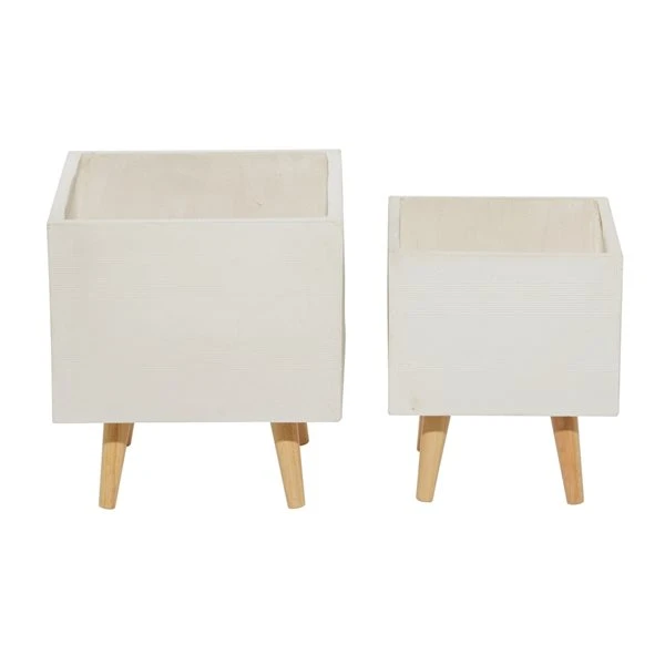 - Highlights an ivory-white planter finish with natural wood brown leg stands