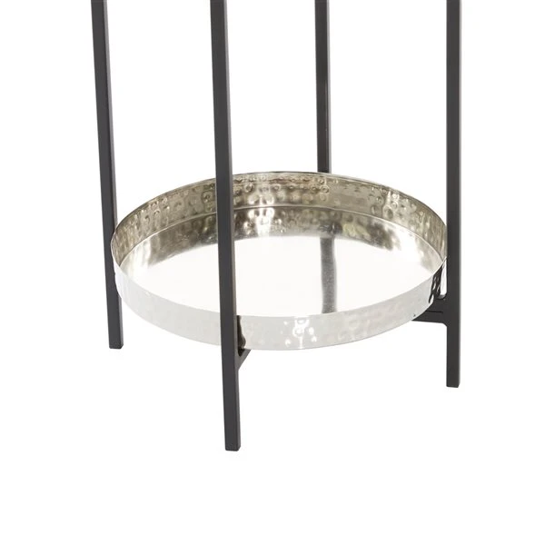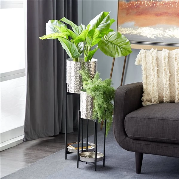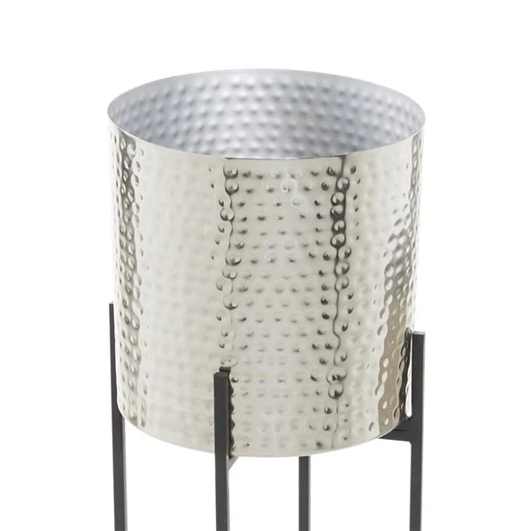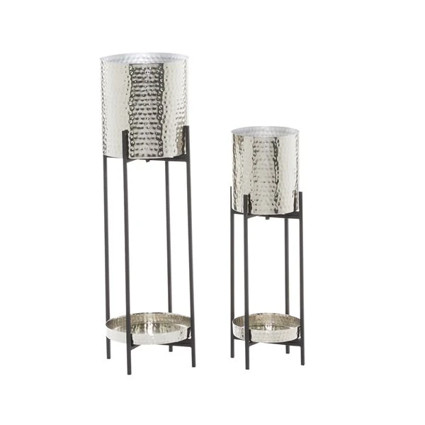 - A hammered design pot on slender frame features a round tray shelf at the base