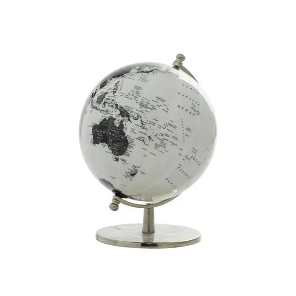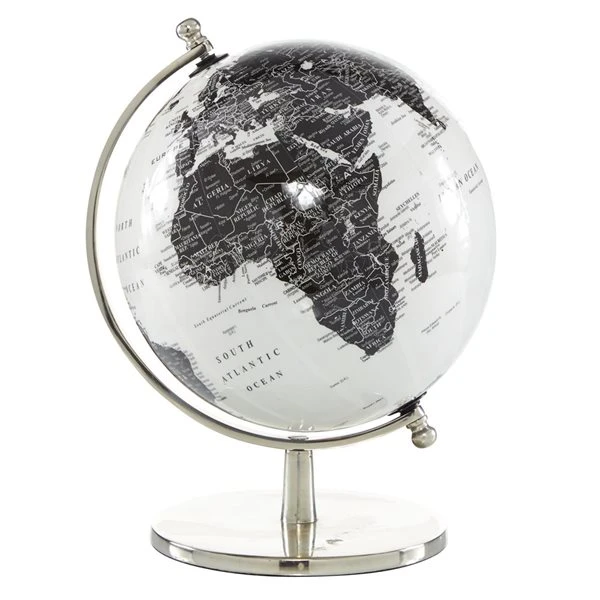 - Landmasses appear in black, while bodies of water are white, features globe spins to labels, borders, and lines of latitude and longitude