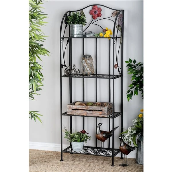 - Serpentine silhouette with metal flower sculptures and 4 metal grid rack shelves
