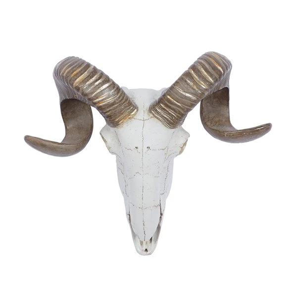 - Features a sculpted skull of a ram with horns