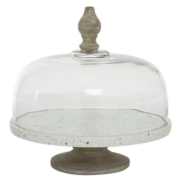 - This contemporary style inspired white glass and terrazzo cloche features a round wood pedestal base complemented with a dome-shaped glass lid with a carved wood handle on top