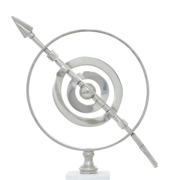 - Sleek aluminum arrow and rings orbit centre sphere on compact and sturdy stoneware base