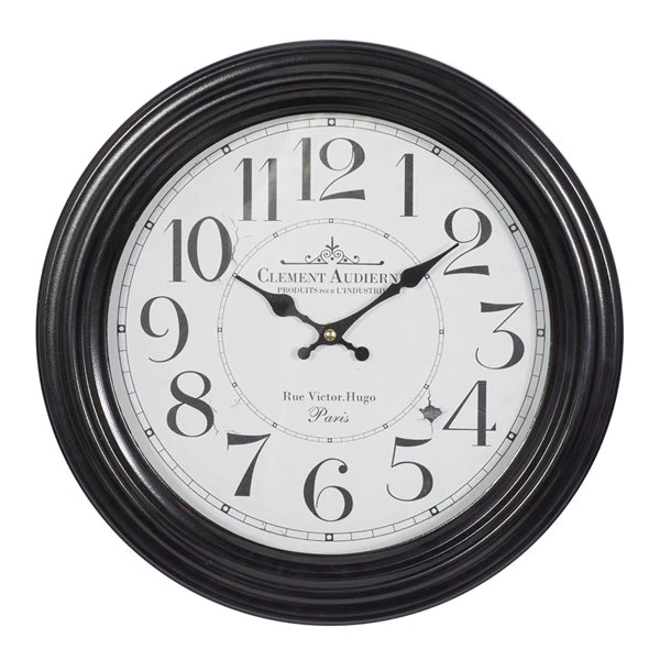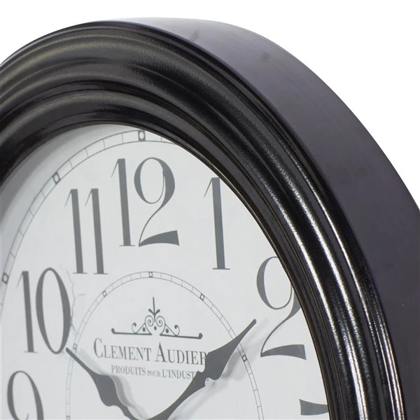 - It features a black bevelled frame, white clock face, black spade hands, and easy-to-read black numerals