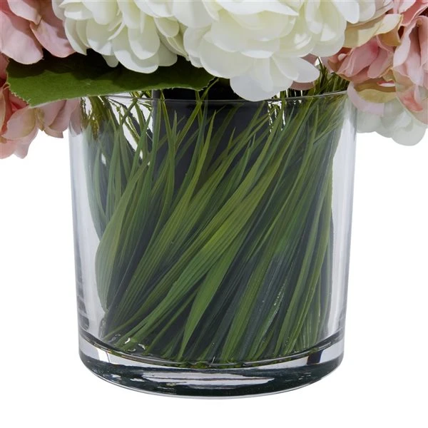 - This artificial hydrangea flowers display is crafted using silk fabric and a glass ceramic vase