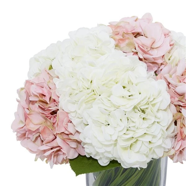 - Floral arrangement featuring white and pink hydrangea flowers with realistic characteristic for a subtle delicate look