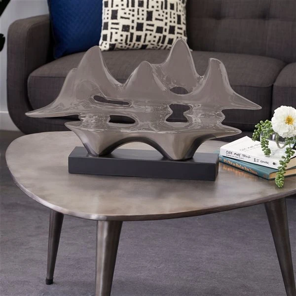 - Appreciate the metallic finish on an abstract silhouette best when you place this sculpture on top of a dark brown wood console table or dresser and against a cream background.