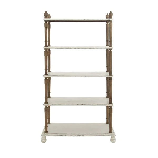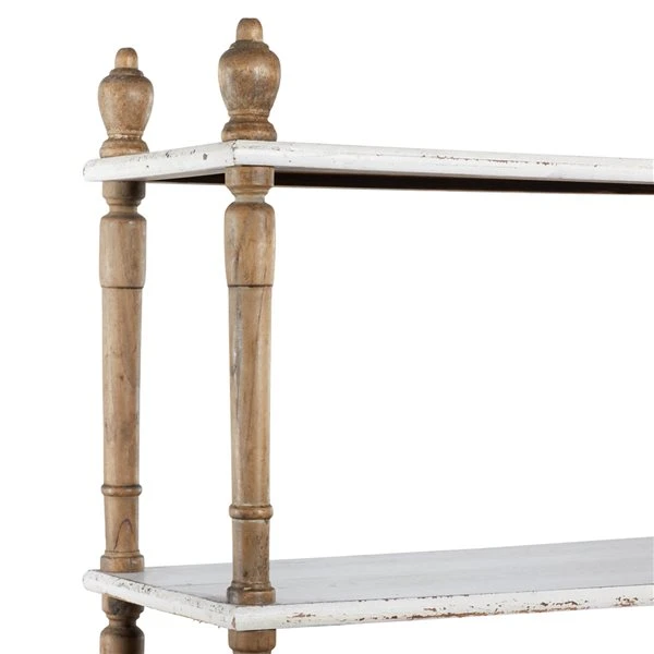 - Features a rectangular shelving unit in distressed white finish