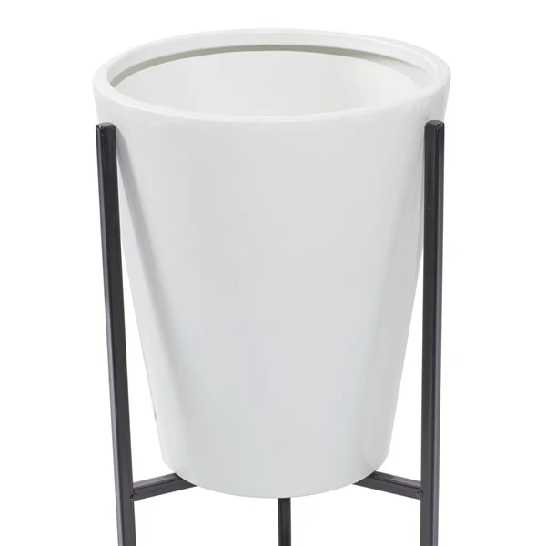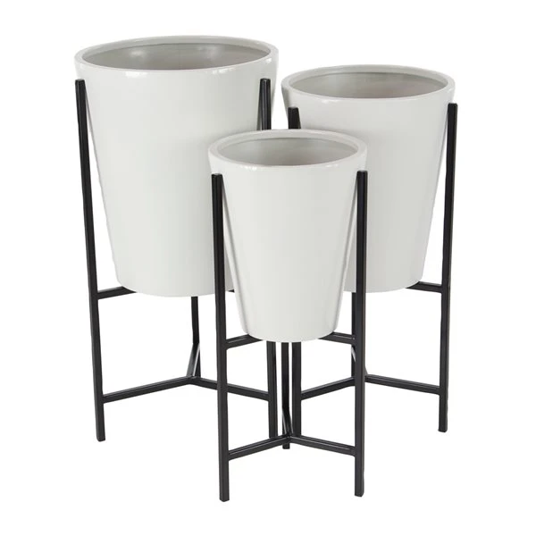 - Designed with tapered cylindrical planter bodies on metal stands with bar supports