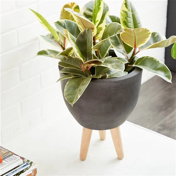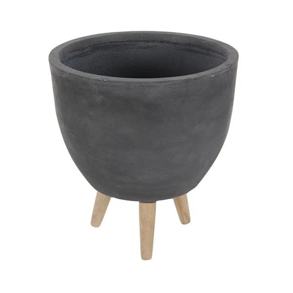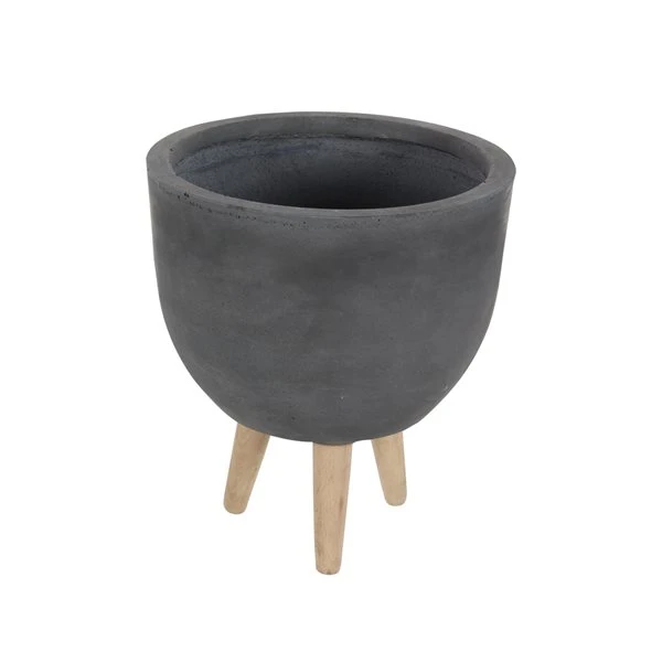 - A matte charcoal grey planters with deep interiors for large plants and light natural beige wooden legs