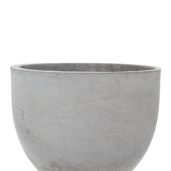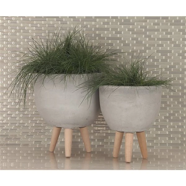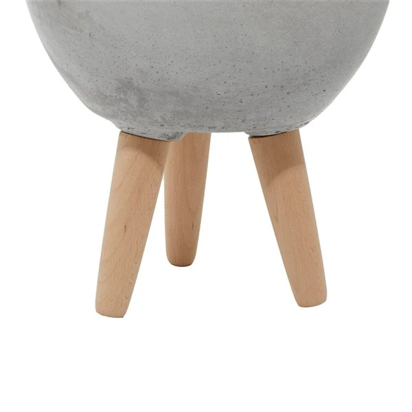 - A muted soft grey planters with matte finish and a light natural brown legs