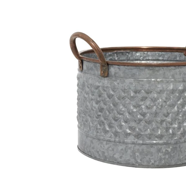 - Features round galvanized metal pots in a textured matte grey finish and copper handles