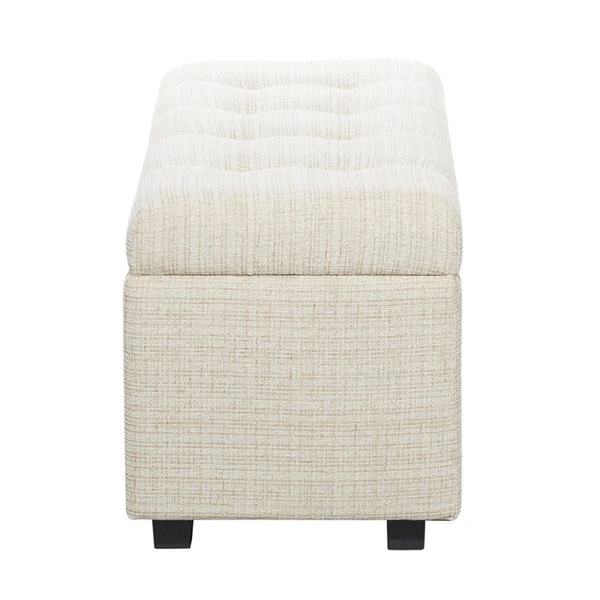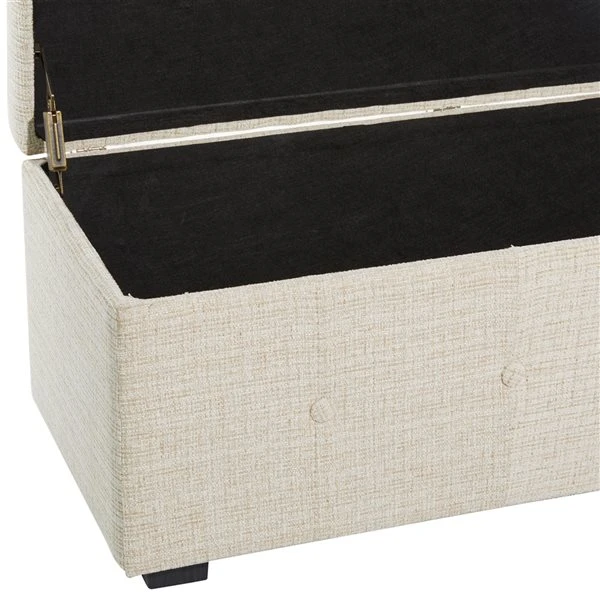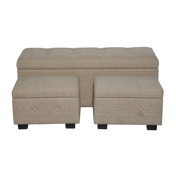 - This indoor storage bench set has beige coloured fabric for traditional style
