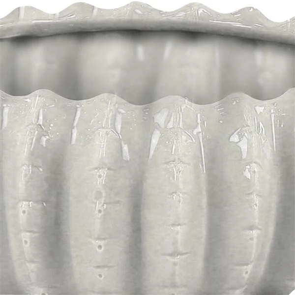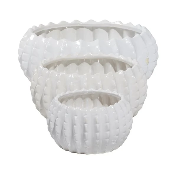- Monochrome glossy white planters with round gourd shapes and textural vertical ridging around each body and wide planter mouth