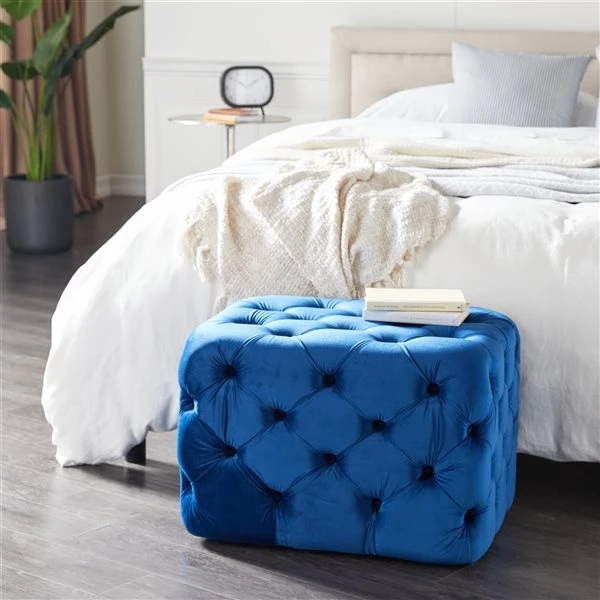 - Smooth, soft royal blue velvet tufted all the way around the body and top with matching blue velvet cushioned