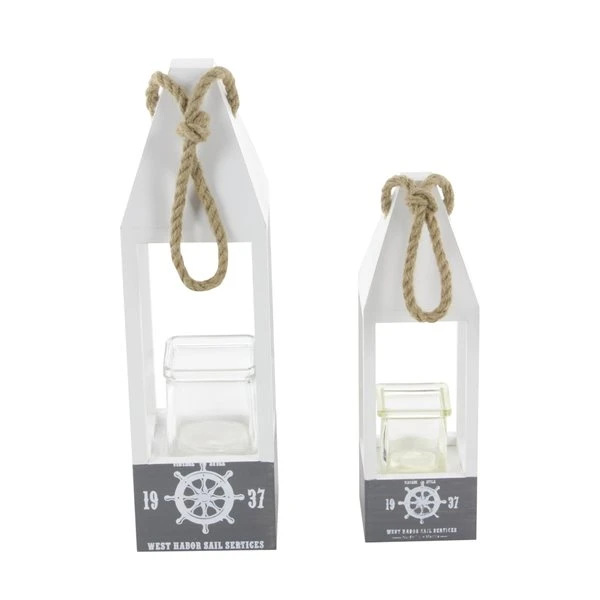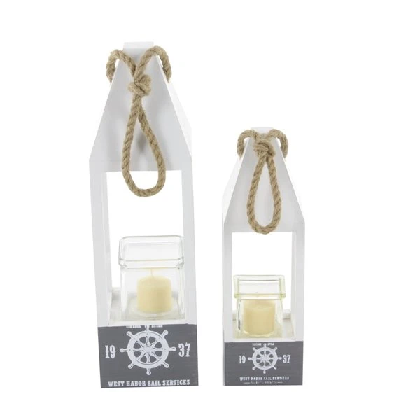 - This wooden candle lantern set has a soft gray finish with brown rope