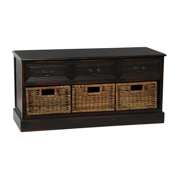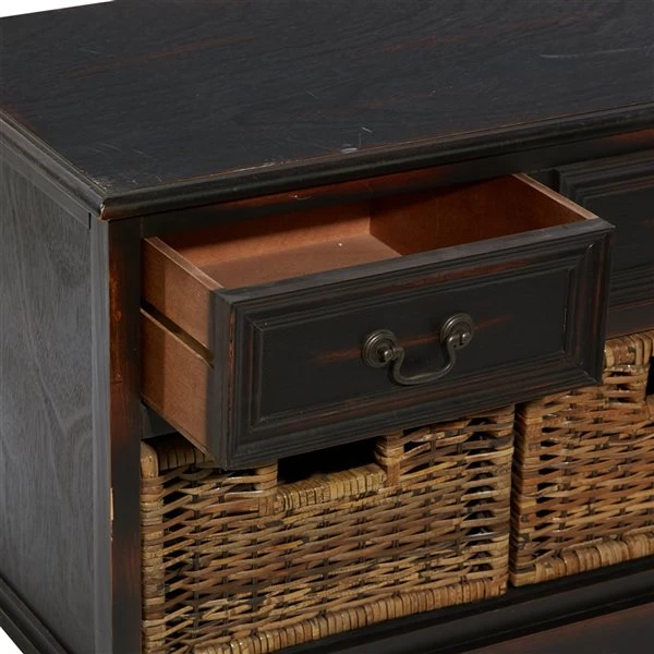 - Features cabinet with 3 drawers with pull handles and 3 shelves with woven seagrass baskets
