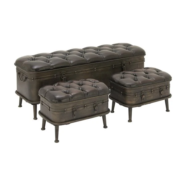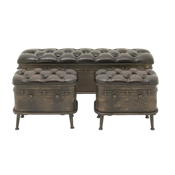 - 1 large and 2 small brown benches that open into interior storage with metal hinges, iron feet elevate each cushioned bench