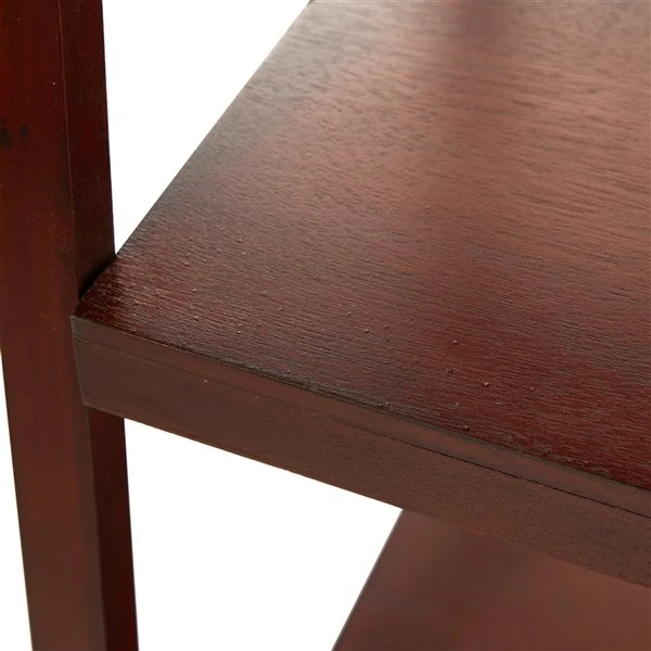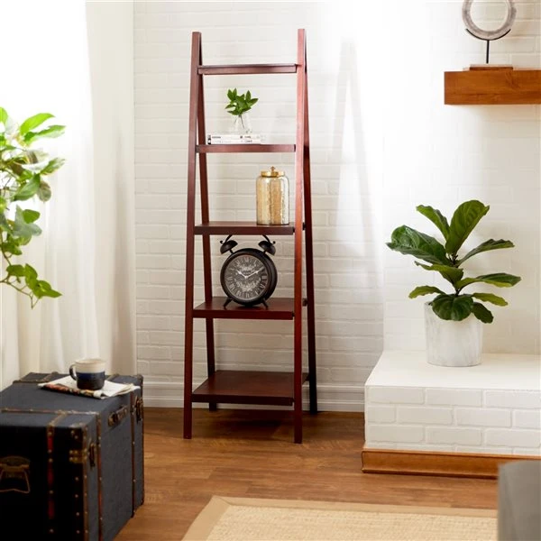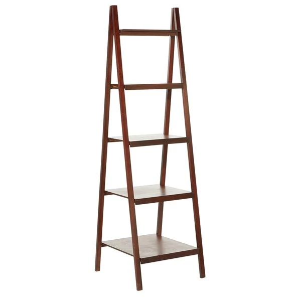 - Open ladder shelf with a reddish-brown finish
