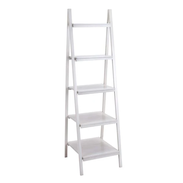 - Open ladder shelf with a matte white finish