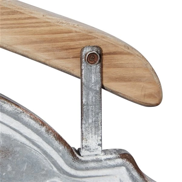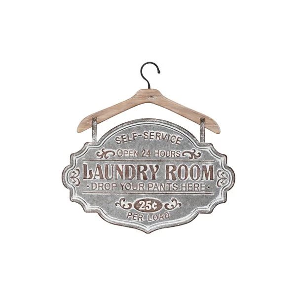 - Features a decorative galvanized metal sign on a whitewashed hanger