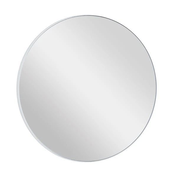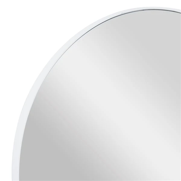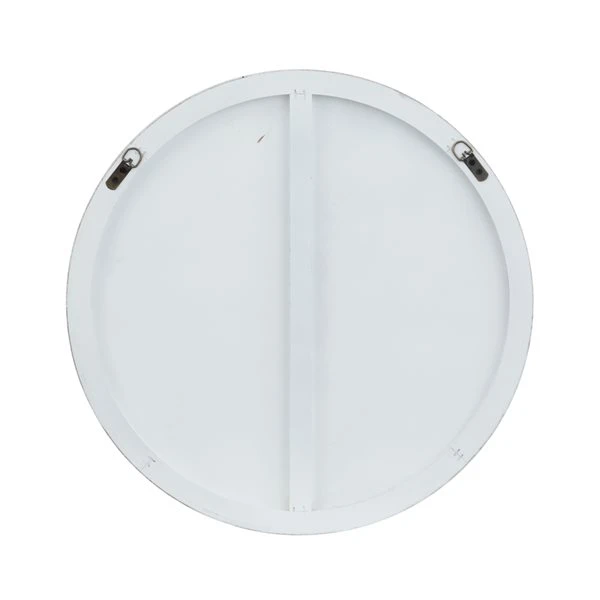 - It features a round-shaped reflective glass and a thin white wooden frame