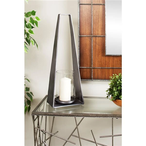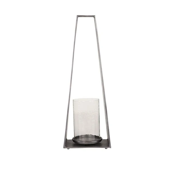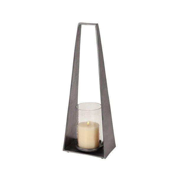 - Solid aluminum frame with triangular silhouette, cylindrical hurricane glass candle holder for pillar candles