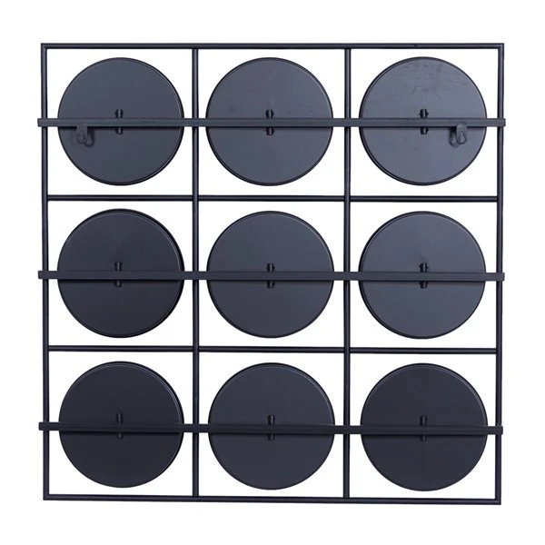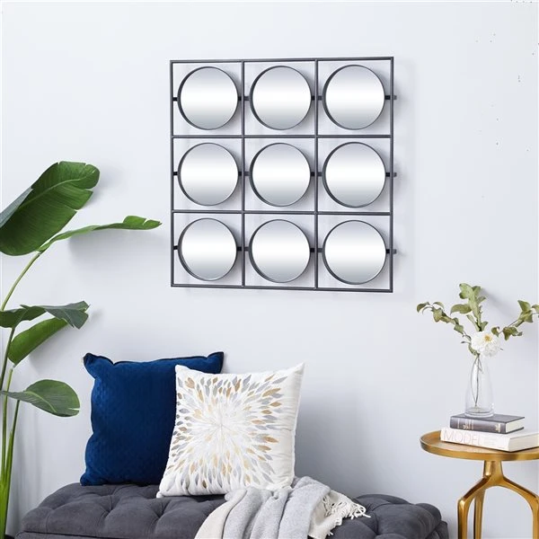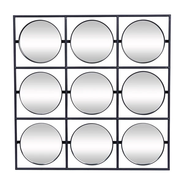 - 9 round mirrors attached to one large square metal frame in individual compartments