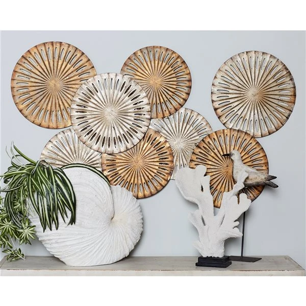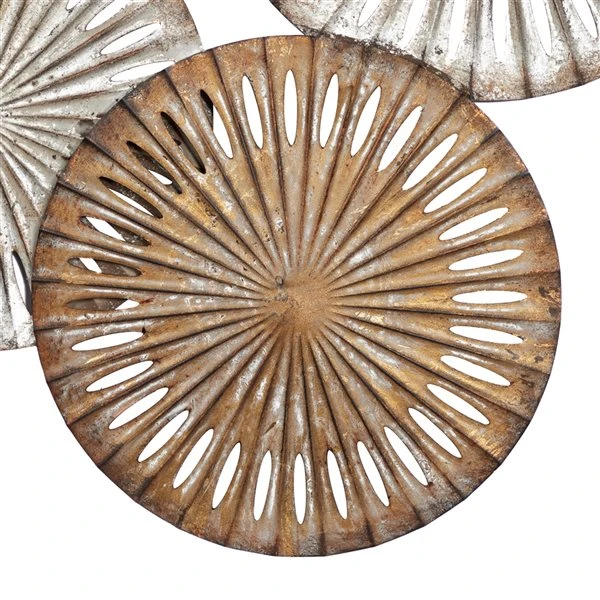 - Features an abstract wall sculpture made of four beige discs and four taupe discs, pierced slits and fluted front designs