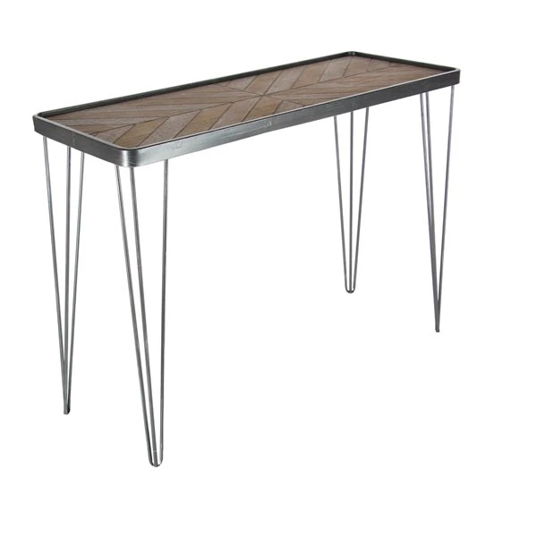 - This metal console table features a wooden table top with metal framing and geometric-styled iron legs