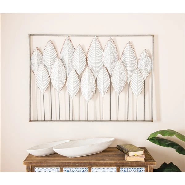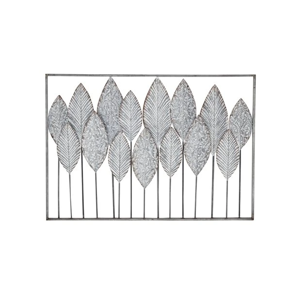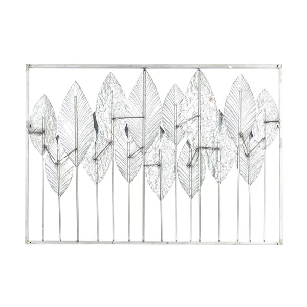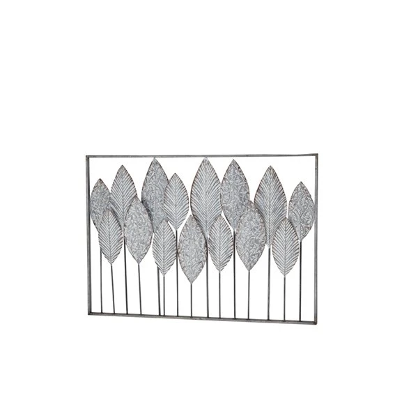 - Features a greyscale leaf design etched in iron displayed inside the frame of thin and long metal sticks