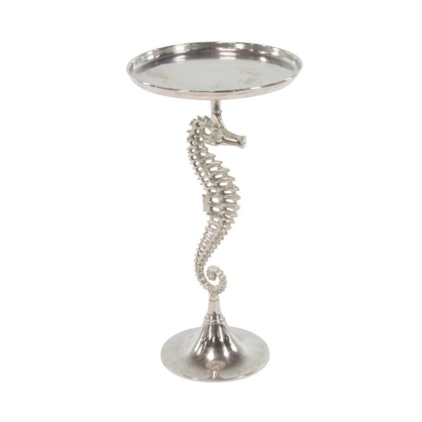 - A silver seahorse accent table constructed of robust and shiny aluminum material