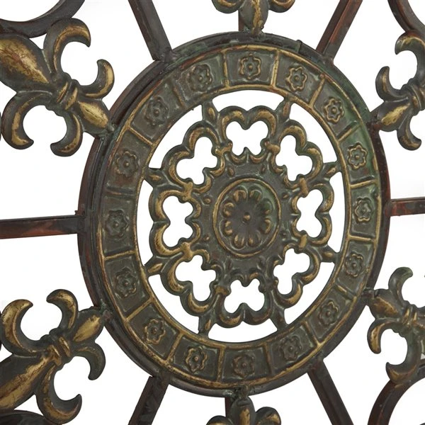 - Decorative quatrefoil emblem in the centre metallic, distressed dark gold, bronze, and copper finish